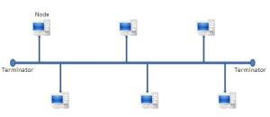 Topologi bus tersusun rapi seperti antrian dan menggunakan cuma satu kabel coaxial dan setiap komputer terhubung ke kabel menggunakan konektor BNC, dan kedua ujung dari kabel coaxial harus diakhiri oleh terminator.